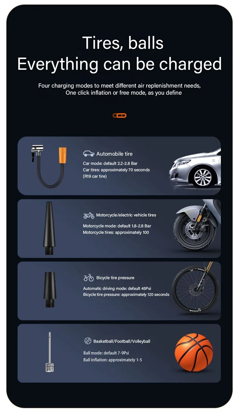 Function: inflatable / pressure measurement / lighting / automatic charging and stopping / five inflatable modes